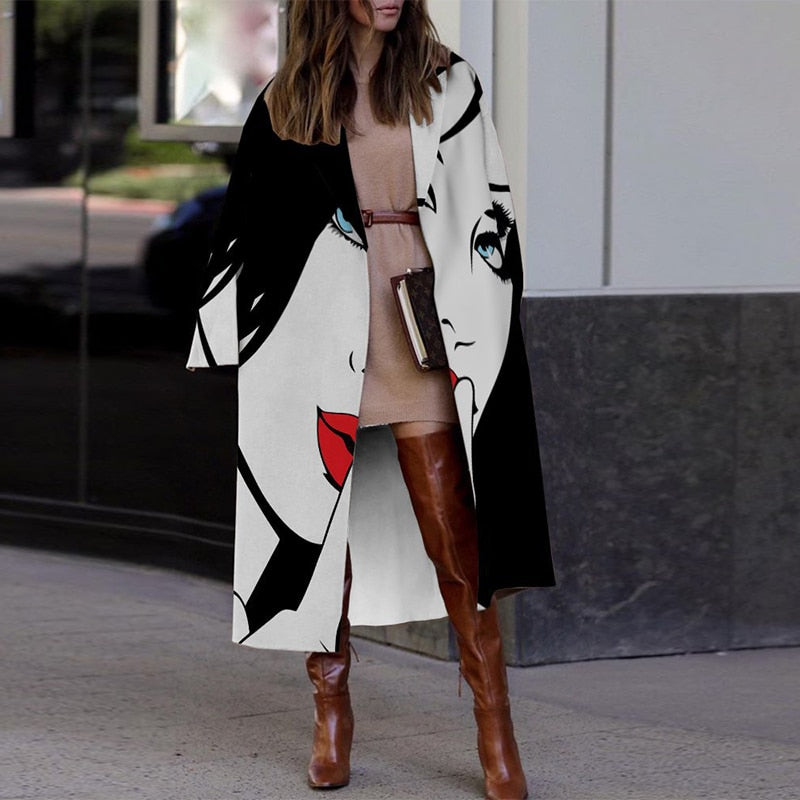 Vintage Abstract Print Turn-Collar Overcoat Fashion Office Ladies Casual Cardigan New Autumn Winter Warm Women Long Woolen Coats